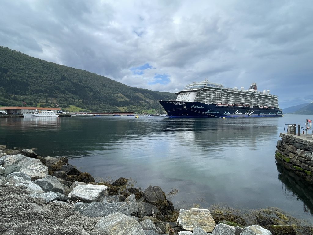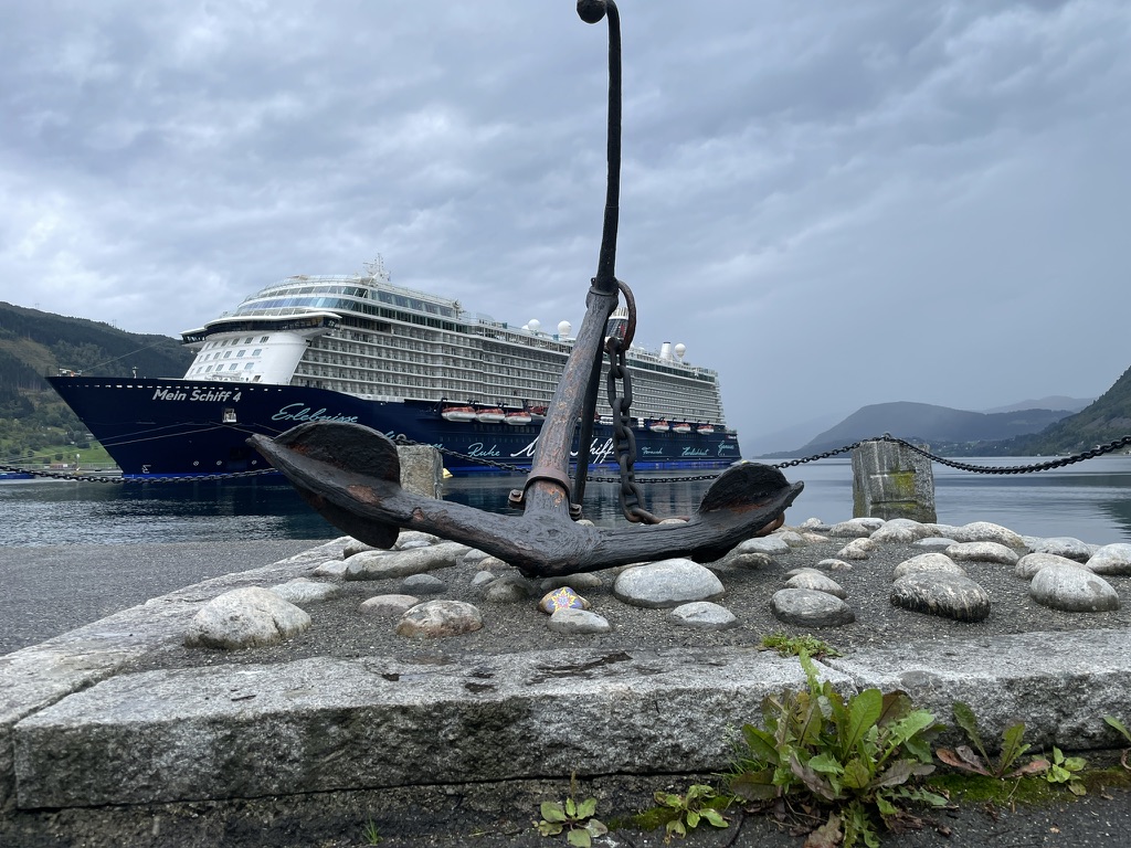 Der nächste Hafen war Nordfjordeid, ein malerischer Ort am Ende des Nordfjords. Besonders beeindruckend ist hier der Anleger, ein einzigartiger Knickarm, der direkt ans Schiff herangeführt wird. Das Schiff wird mit Tauen an beweglichen Tonnen befestigt – eine Konstruktion, die weltweit einmalig ist. Am Vormittag unternahmen wir einen Spaziergang durch das Städtchen Eid, vorbei an typisch norwegischen Häusern, die von Trollen bewacht zu werden scheinen. Besonders sehenswert ist die Kirche von Eid. Außerdem kann man ein Wikingermuseum besichtigen. Die schön angelegte Uferpromenade bietet einen herrlichen Ausblick, auch auf unser Schiff.