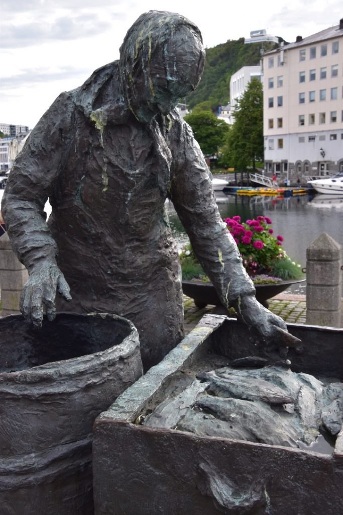Der Weg führte uns zunächst bergauf und dann wieder bergab. Entlang der Uferpromenade erreichten wir den Fischmarkt mit zahlreichen Aquarien und einer beeindruckenden Vielfalt an Meeresbewohnern. Besonders beeindruckend waren die Königskrabben und vor allem die außergewöhnliche Frische der Fische und Meeresfrüchte, wie wir sie so nicht kannten. Wir schlenderten weiter und kamen an einem Wochenmarkt vorbei, auf dem unter anderem Walfleisch angeboten wurde – aus ethischen Gründen sollte man hiervon jedoch Abstand nehmen. Bald standen wir vor den berühmten Kontorhäusern. Nach deren Besichtigung gingen wir durch Wohnstraßen in Richtung Seilbahn zum Hausberg Fløyen und dann langsam zurück zum Schiff. Auf dem Rückweg gönnten wir uns noch einen landestypischen Fischsnack. Bergen wir kommen wieder!