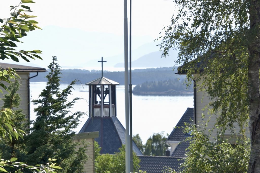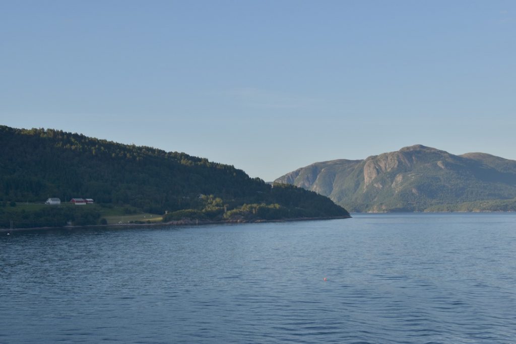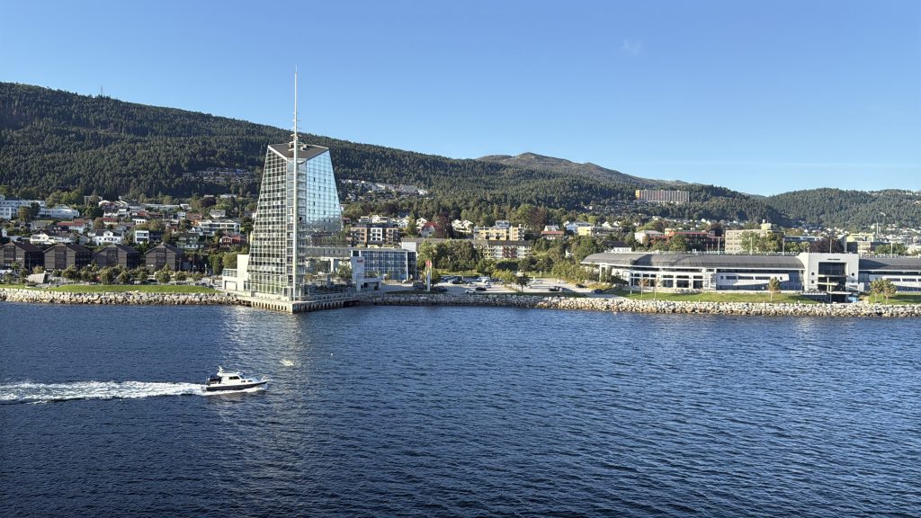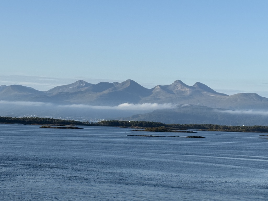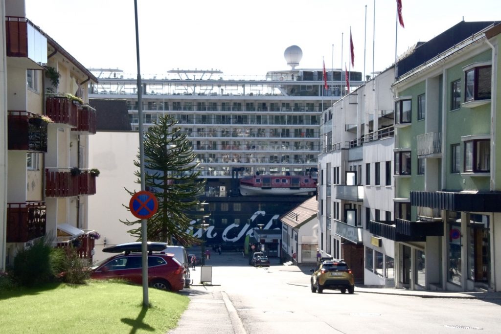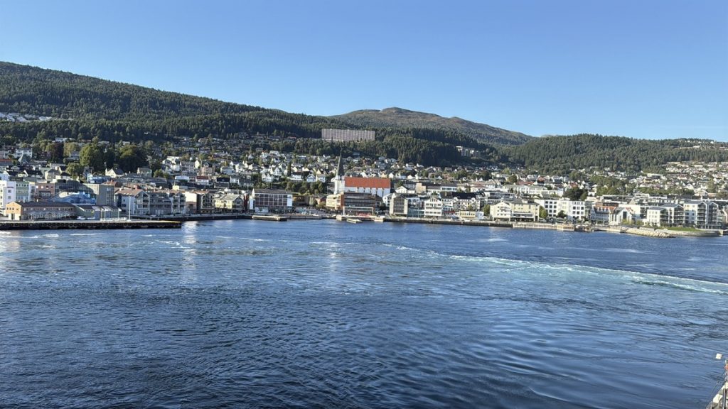 Frühmorgens erreichten wir den zweiten norwegischen Hafen auf unserer Reise und legten in Molde an. Molde ist eine Kleinstadt mit rund 33.000 Einwohnern und wird von dem Romsdal-Gebirge gesäumt, einer herrlichen Bergkette entlang des Fjords. Der Anleger liegt direkt im Stadtzentrum, sodass eine der Sehenswürdigkeiten von Molde leicht zu Fuß zu erreichen war. Wir hatten uns im Vorfeld bereits einige interessante Ziele ausgesucht und machten uns auf Erkundungstour, zunächst in Richtung des Freilichtmuseums Romsdalmuseum, etwa 15 Gehminuten vom Schiff entfernt, wobei es steil bergauf ging. Mit Hilfe von Google Maps, aber dennoch zielsicher, erreichten wir schließlich unser Ziel und waren sofort angetan von den alten, typisch norwegischen Häusern, die aus Holz gebaut und pastellfarben gestrichen sind. Auch hier zeigt sich wieder die Fähigkeit der Norweger, Alt und Neu harmonisch in Einklang zu bringen. Neben dem Ausstellungsgelände wurde auch ein modernes Holzgebäude errichtet, das neben einem Shop und der Ticketkasse auch eine Ausstellung bietet. Wir beschränkten unseren Besuch jedoch auf das Freigelände mit zahlreichen Gebäuden; einige waren geöffnet, und einheimische Frauen in traditionellen Gewändern erklärten alles rund um die Geschichte und Bedeutung. Es wurden auch regionale Köstlichkeiten angeboten und selbstverständlich Souvenirs – unsere Magnetsammlung hat Zuwachs bekommen. Man kann nur staunen über den Einfallsreichtum der Norweger, wenn man bedenkt, in welcher Zeit diese Häuser entstanden sind. Viele kleine und große Details in, an und um die Gebäude zeigen dies, zum Beispiel anhand von Verzierungen oder praktischen Gegenständen und Einbauten. Die Entstehungsgeschichte reicht bis ins 17. Jahrhundert zurück. Ein äußerst interessanter Besuch, zumal die Stadt Molde, wenn auch nur für kurze Zeit, Hauptstadt von Norwegen war. Vom Museum führt ein Pfad zu einem Pavillon, von dem man einen herrlichen Blick über Molde genießen kann. Wir schlenderten weiter zum Dom von Molde. Besonders ist zum einen, dass Turm und Kirchenschiff getrennt sind, und zum anderen die Ausgestaltung des Gotteshauses. Diese Schlichtheit hat uns zutiefst beeindruckt, und auch das Eingangsportal mit seinen Mosaiken ist etwas ganz Besonderes. Gleich daneben befindet sich das mit Rosen gesäumte Dach des Rathauses, ein wunderschöner Platz zum Verweilen, um sich an der Farbenpracht zu erfreuen und den Ausblick über die Promenade zu genießen. Wir machten uns dann langsam auf den Rückweg zum Schiff, da heute eine Ausweiskontrolle durchgeführt wurde, um unsere Ausreise aus dem Schengen-Raum zu legitimieren. Für den Rückweg wählten wir die Promenade mit zahlreichen Geschäften und Lokalen. Zurück auf dem Schiff und nach absolvierter Passkontrolle gönnten wir uns eine kleine Stärkung in der Außenalster, einer Bar mit Bistro am Heck des Schiffes. Und so neigte sich der siebte Tag unserer Reise dem Ende entgegen. Wir genossen die Ausfahrt aus dem Fjord auf dem Balkon unserer Kabine und stellten uns schon darauf ein, eine Stunde länger schlafen zu dürfen. Die Uhren wurden erstmals auf dieser Fahrt um eine Stunde zurückgestellt, weitere sollten folgen. Unser Ziel, die USA, liegen ja sechs Stunden zurück. Natürlich durfte ein Absacker an der Bar nicht fehlen.