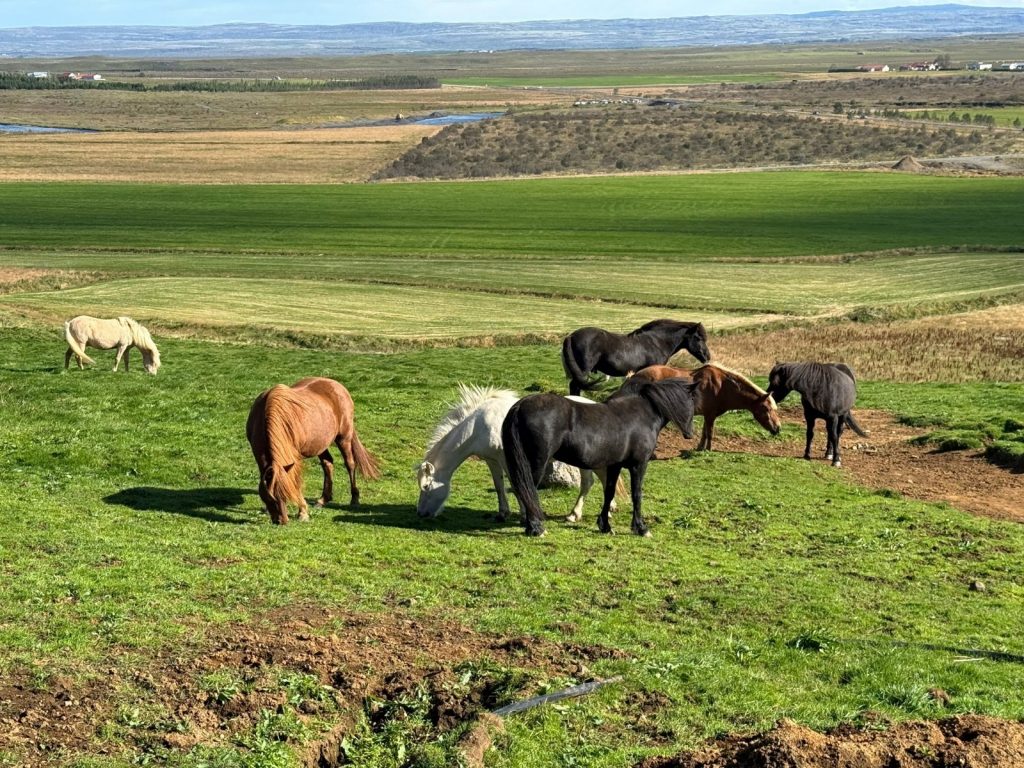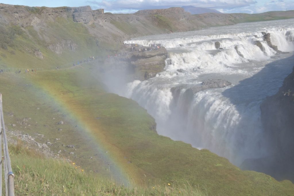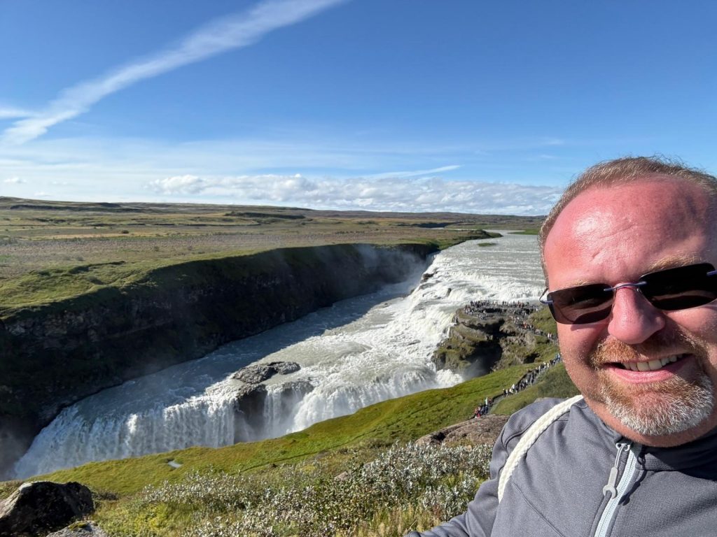 Die Nacht war für uns gegen 5:30 Uhr rum und nach dem Kultivieren verfolgten wir das Einlaufen und Anlegen im Hafen von Reykjavik. Das Frühstücksbuffet öffnete um 6:30 Uhr, wir waren überpünktlich und die Türen waren noch geschlossen, was wir noch nie zuvor erlebt hatten. Der Treffpunkt für unseren Ausflug war außerhalb des Terminals und fußläufig ca. 10 Minuten entfernt. Nachdem wir uns kurz orientiert hatten, fanden wir unseren Kleinbus für 19 Personen und unserem Fahrer mit Spitznamen „Dotti“. Dotti sprach sehr gut deutsch und wie sich herausstellt nicht von ungefähr. Dotti war bereits lange Jahre in Österreich als Hotelier und Skilehrer tätig. Nun pünktlich wie angesagt starteten wir zusammen mit 17 Mitpassagieren zu unserer wie sich letztlich zeigen sollte 9-stündigen Rundfahrt. Wir verließen das Hafengelände und Reykjavik in Richtung Südosten der Insel und waren sofort beeindruckt von der abwechslungsreichen Landschaft. Endlose Weiten, bedeckt mit isländischem Moos, mal hell mal dunkel, unzählige Vulkane verschiedenster Größe und Form, die alle noch aktiv sind. Man sieht Gletscher, Flüsse und Seen, es ist einfach herrlich anzuschauen und ganz besonders. Unser erstes Ziel was der Ort Hveragerdi, wo in einem kleinen Einkaufszentrum ein Infocenter über die Vulkanität und Plattentektonik. Durch das Gebäude verläuft der Graben zwischen der Eurasischen und der Nordamerikanischen Platte. Dem Besucher wird dieses mittels einer Glasplatte im Boden und einer Ausleuchtung, als würde Magma brodeln und fließen dargestellt. Weiter ging unsere Fahrt zu einem, ausnahmsweise erloschenen Vulkan, der natürlich zahlreiche Touristen anzieht. Der Kratersee und das Drumherum sind wirklich faszinierend anzuschauen, da man solche Natur ausschließlich aus den Medien kennt. Auch der Erdboden in dieser Region ist besonders, da er neben der Lava, dem Basaltgestein auch sehr viel Eisen enthält, was die rote Farbe zeigt. Nachdem wir den Kratersee einmal umrundet haben, bergauf und bergab ging es weiter in Richtung Westen zum Gullfoss Wasserfall. Mal abgesehen von den zich Touristen, ein absoluter WOW Effekt. Das Wasser stammt von einem Gletscher, durchfließt unter der Erdoberfläche eine Schicht Vulkanlava und reinigt sich so von selbst, so dass es tatsächlich Trinkwasserqualität erreicht. Der Gullfloss stürzt in zwei Stufen rund 32 Meter in die Tiefe und zeigt so, welche Naturgewalt Wasser in sich birgt. Beeindruckend und feucht zugleich, denn das abfallende Wasser löst natürlich einen Nieselregen aus und gepaart mit dem Wind, der auf Island zumeist herrscht, fühlt man sich wie unter einer Dusche. Ein schöner Nebeneffekt des Ganzen ist die Entstehung von Regenbögen. Auch das war ein absolutes Highlight. Wir setzten unsere Fahrt fort ins Gebiet mit den heißen Quellen und Geisiren, auch das ein absoluter Besuchermagnet und wie uns Dotti verriet, waren an diesem Tag außergewöhnlich viele Besucher hier. Geschuldet war dies auch dem herrlichen Wetter, das wir glücklicherweise auf Island den ganzen Tag hatten. Das weitläufige Gelände beherbergt mehrere Geisiere, von klein bis groß. Der Große zeigt noch sein Können im Abstand von einer Viertelstunde, der mittlere ist schon eingeschlafen und bei den kleinen plubbert es noch etwas. Ein Naturschauspiel höchster Güte. Wenn nur nicht immer so viele Touristen gleichzeitig an solchen Orten wären, dann könnte man das viel besser genießen und das erlebte richtig aufsaugen. Aber so ist es halt und man selber ist ja auch da, so dass andere das gleiche sagen könnten. Und so ging es weiter, zunächst zu einem Bauernhof mit u.a. Kühen und selbst hergestellter Eiscreme. Wir seilten uns stattdessen kurz ab und besuchten die Islandpferde des Bauern, die gerade auf der Weide grasten und einen so beruhigenden Anblick boten, um kurz innezuhalten. So herrliche Tiere in allen bekannten Farben und man merkte, dass es ihnen gut geht. Wir setzten die Fahrt mit Dotti am Steuer fort und er brachte um zum Ufer des Sees Laugarvatn, der ebenfalls von heißen Thermalquellen erwärmt wird und an dessen Ufer Brot gebacken wird. Hierzu wird ein etwa 50 cm tiefes Loch in die Erde gegraben, eine Schale mit Brotteig hineingelegt, mit der Erde verschlossen und wie ein Vulkan aufgeschichtet. Zudem werden kleine Steine als Markierung auf die Spitze gelegt, um zu signalisieren, da ist was drunter. Dotti hatte vorgeschnittenes Brot dabei und ließ es uns probieren. Man könnte sagen es schmeckt wie Malzbrot, etwas süßlich und saftig. Und so ging es weiter zur letzten Station, dem Dingvellir Nationalpark. Dieser Nationalpark liegt nördlich des gleichnamigen Sees und beeindruckt durch eine weitläufige, mit Bächen und Flüsschen durchzogene Landschaft. Aber die größte Attraktion ist die Felsspalte oder besser gesagt der Riss zwischen der Eurasischen und Nordamerikanischen Erdplatte, der sich jedes Jahr um gut 3 Zentimeter vergrößert. Es ist schon ein erhabenes Gefühl hier mit einem Schritt zwischen zwei sich bewegenden Erdplatten hin und her hüpfen zu können. Und was sich darunter abspielt, wenn das heiße Magma im Erdinnern diese Platten bewegt. Ja, Island ist äußerst beeindruckend. Dotti ließ uns an einem der vier Parkplätze aussteigen und wir wanderten dann durch die Landschaft am Fuß des Risses, eine Landschaft wie ein Auenpark mit Brücken und Flüsschen. Jetzt ging es bergauf zum Hauptplateau mit Besucherzentrum, wo uns Dotti wieder aufsammelte. Wir gingen sozusagen mittens durch den Riss die Anhöhe hinauf, gesäumt von beeindruckenden Gesteinsformationen. Oben angekommen, zeigte sich erneut ein wundervoller Rundumblick über die atemberaubende Landschaft Islands. Nun gings es zurück nach Reykjavik, wo uns Dotti abschließend zunächst zum Wahrzeichen der Stadt der Hallgrimskirche chauffierte und dann noch durch die Altstadt mit ihren Denkmälern, Parks und typisch isländischen Gebäuden. Dotti meine, um die Altstadt per Fu