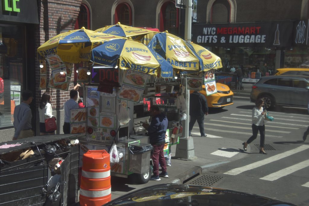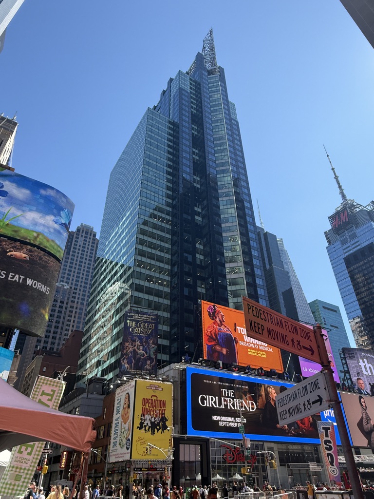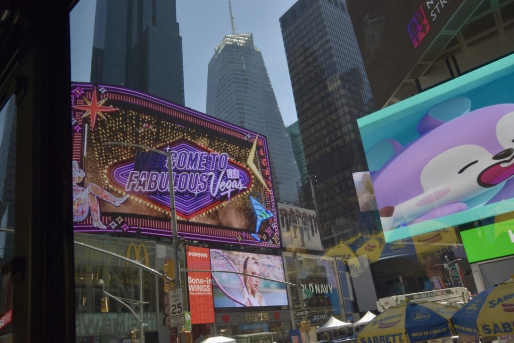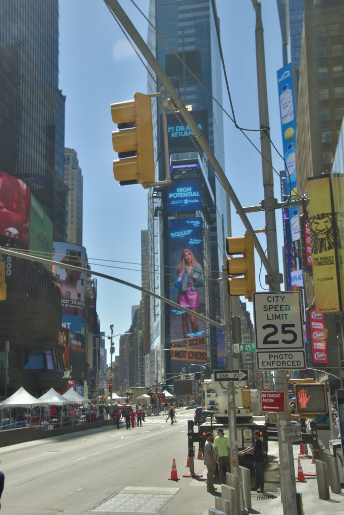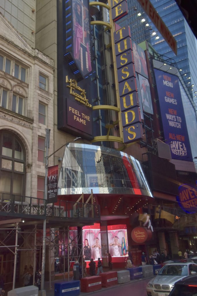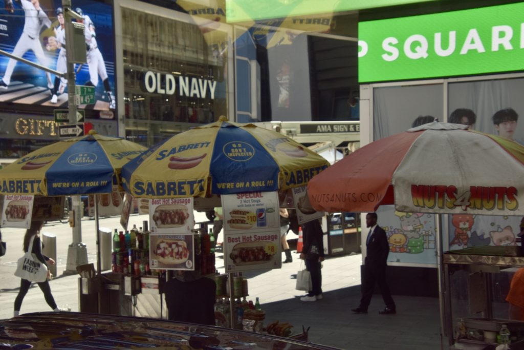 Unser erstes Ziel war der Times Square, wo wir anderthalb Stunden zur freien Verfügung hatten, um die nähere Umgebung zu erkunden. So schlenderten wir entlang, vorbei an den riesigen Leinwänden, Geschäften und an jeder Ecke einem oder mehreren Hotdog-Ständen. Natürlich konnte ich nicht widerstehen und gönnte mir einen originalen Hotdog mit Senf, Mayo und Ketchup, dazu eine Cola – und weg waren 16 Dollar. Vorher gab es einen kleinen Becher fertig geschnittenes Obst für 6 Dollar – ein kleiner Luxus. Vor dieser Stärkung hatten wir ein Erlebnis der anderen Art. Ich stand gerade an einem Souvenirstand für den obligatorischen Magneten, da schrie mir meine Frau zu: Mickey und Minnie Mouse überrumpelten sie zu einem Foto, und ich sollte natürlich auch mit drauf. Prompt zeigten sie mir einen Zettel mit der Aufschrift „Tipp für Trinkgeld“ und ein Bündel Dollarscheine, ein 20er obenauf. Ich, völlig überrumpelt, ließ mich darauf ein und gab ihnen 20 Dollar für vier Fotos sozusagen. Ich war noch immer perplex und ärgerte mich über mich selbst, aber kurz danach sahen wir, wie die drei dasselbe Spiel bei einem älteren Ehepaar vollzogen, die ihnen aber nichts dafür gaben. Meine Frau sprach zunächst das Ehepaar an und schnappte sich eine der drei Mäuse. Sie schaffte es tatsächlich, zumindest 10 Dollar wieder zurückzubekommen, allerdings mit Androhung der Polizei. So wanderten wir weiter auf den Straßen und gönnten uns eine Stärkung.