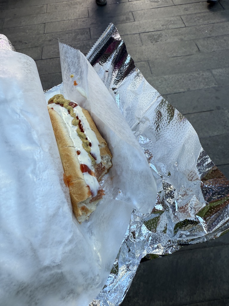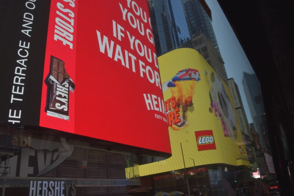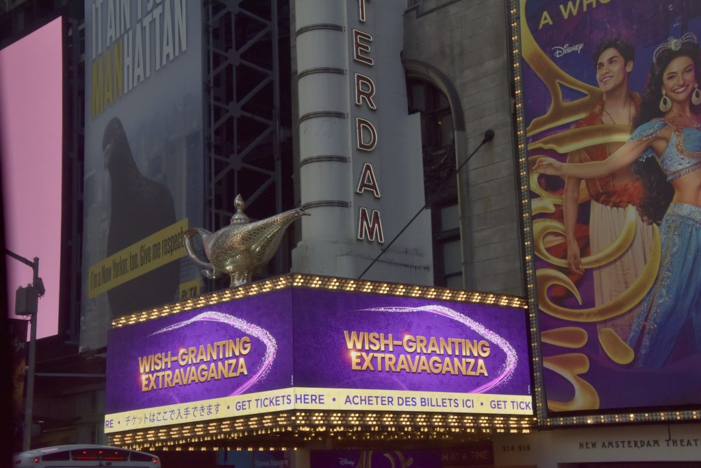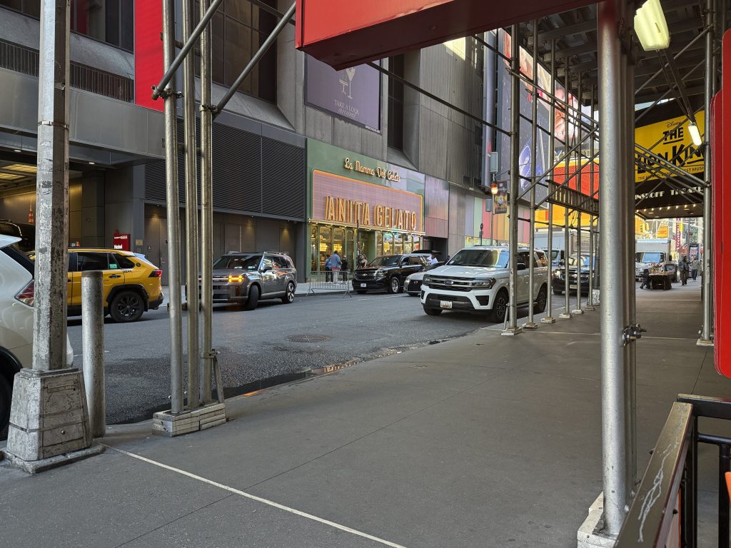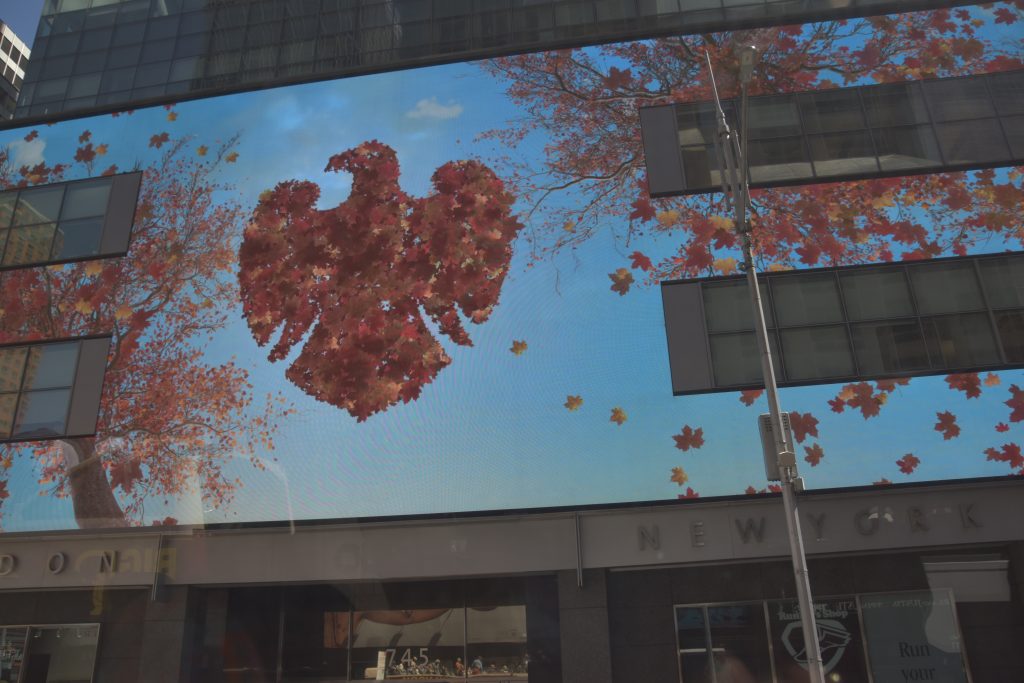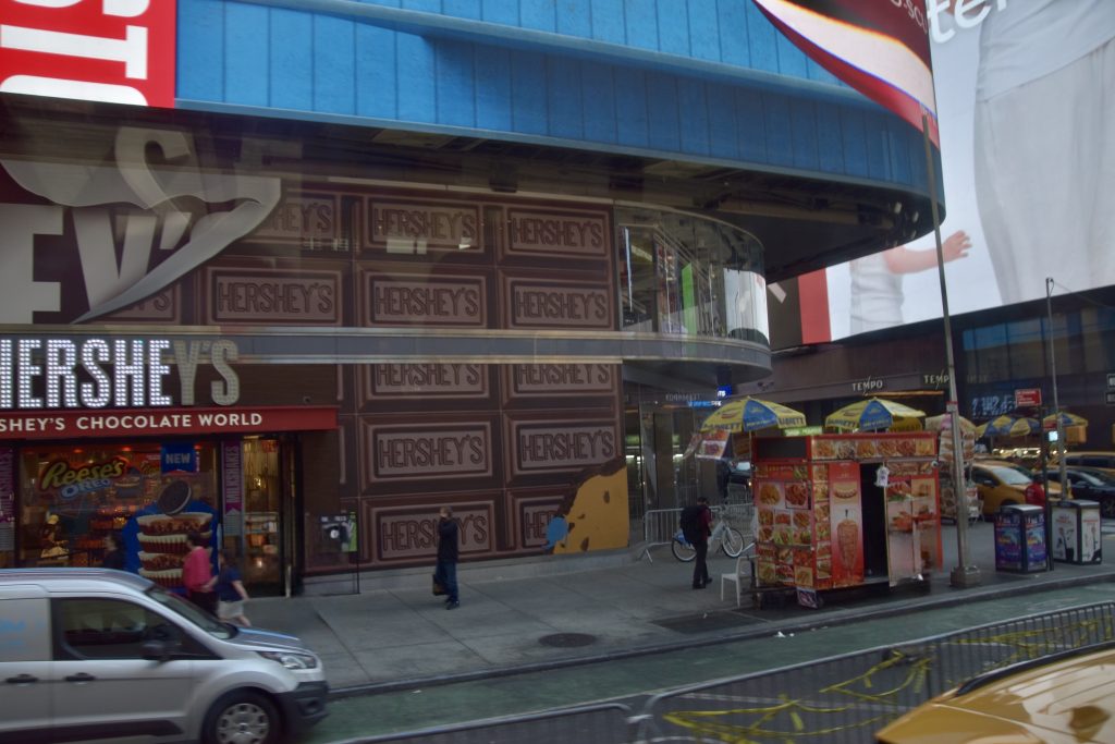 Unser erstes Ziel war der Times Square, wo wir anderthalb Stunden zur freien Verfügung hatten, um die nähere Umgebung zu erkunden. So schlenderten wir entlang, vorbei an den riesigen Leinwänden, Geschäften und an jeder Ecke einem oder mehreren Hotdog-Ständen. Natürlich konnte ich nicht widerstehen und gönnte mir einen originalen Hotdog mit Senf, Mayo und Ketchup, dazu eine Cola – und weg waren 16 Dollar. Vorher gab es einen kleinen Becher fertig geschnittenes Obst für 6 Dollar – ein kleiner Luxus. Vor dieser Stärkung hatten wir ein Erlebnis der anderen Art. Ich stand gerade an einem Souvenirstand für den obligatorischen Magneten, da schrie mir meine Frau zu: Mickey und Minnie Mouse überrumpelten sie zu einem Foto, und ich sollte natürlich auch mit drauf. Prompt zeigten sie mir einen Zettel mit der Aufschrift „Tipp für Trinkgeld“ und ein Bündel Dollarscheine, ein 20er obenauf. Ich, völlig überrumpelt, ließ mich darauf ein und gab ihnen 20 Dollar für vier Fotos sozusagen. Ich war noch immer perplex und ärgerte mich über mich selbst, aber kurz danach sahen wir, wie die drei dasselbe Spiel bei einem älteren Ehepaar vollzogen, die ihnen aber nichts dafür gaben. Meine Frau sprach zunächst das Ehepaar an und schnappte sich eine der drei Mäuse. Sie schaffte es tatsächlich, zumindest 10 Dollar wieder zurückzubekommen, allerdings mit Androhung der Polizei. So wanderten wir weiter auf den Straßen und gönnten uns eine Stärkung.