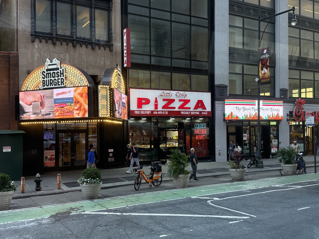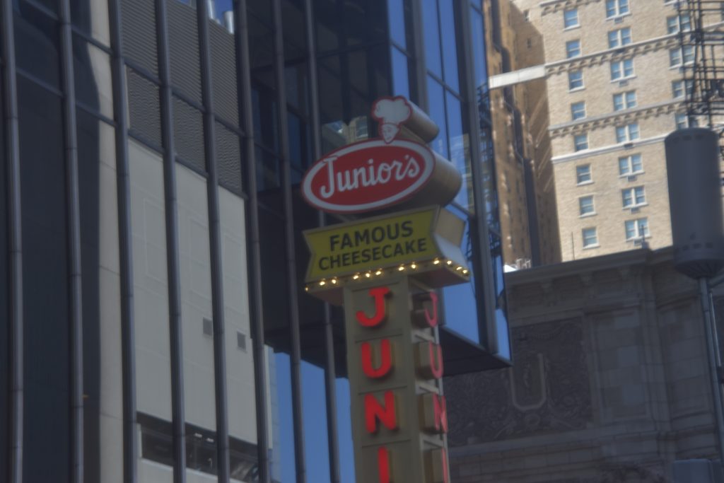 Nördlich unseres Treffpunkts nahmen wir eine Seitenstraße in Richtung Westen und staunten nicht schlecht über eine Traube von Menschen, die für irgendetwas anstanden. Die Menschenschlange zog sich um einen halben Block von etwa 200 Länge, und wie sich herausstellte, war gerade Fashion Week. Unsere Freizeit war fast rum, und so steuerten wir noch eine Bäckerei an, in der es den besten Käsekuchen New Yorks geben sollte. Zwei Stücke vom Original in einer Plastikbox machten 18 Dollar inklusive zwei Gabeln und neun Servietten – typisch amerikanisch halt. Aber lecker war der Kuchen, und es gab auch noch verschiedene Variationen.