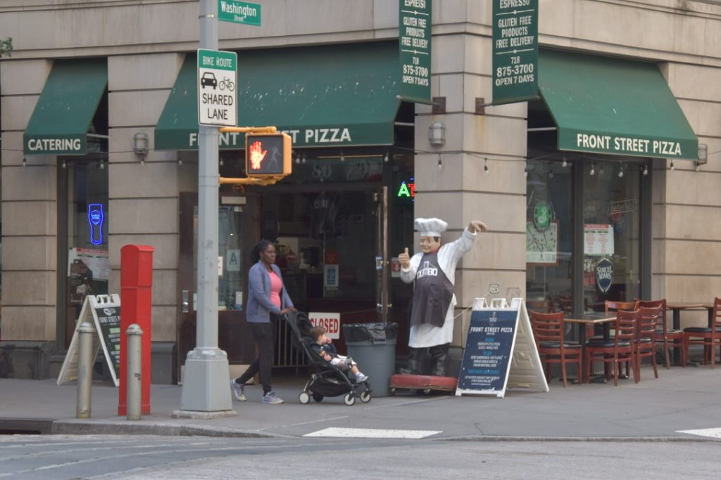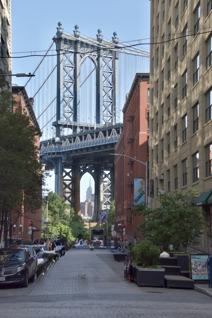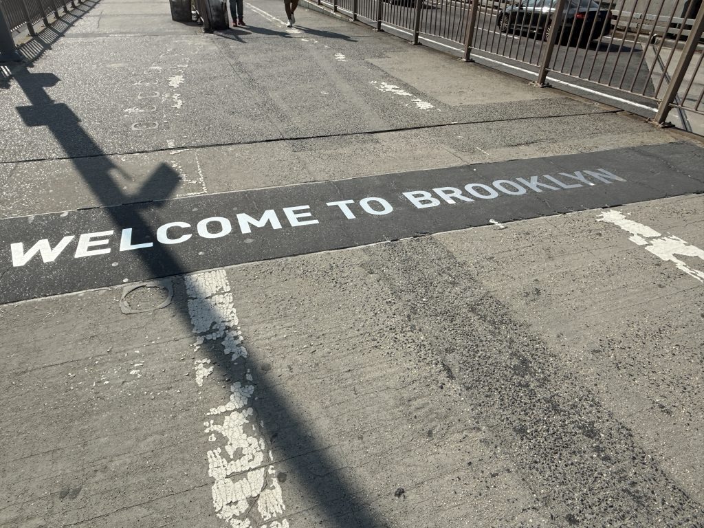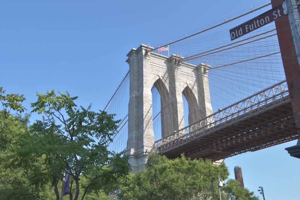 Die Fahrt führte uns dieses Mal durch den Holland Tunnel nach Manhattan, Queens und Greenwich Village bis nach Brooklyn. Auch auf dieser Fahrt bestaunten wir die Gebäude und Straßenzüge der Stadt, die uns über die Williamsburg Bridge nach Brooklyn brachte. Erstes Ziel war der Brooklyn Bridge Park und Pier direkt neben der Brooklyn Bridge, wo sich einer der imposanten Pfeiler auftürmte. Nach einem kurzen Fotostopp wanderten wir in der Gruppe in Richtung Aufgang zur Brücke, mit einem Abstecher zu den Toiletten einer kleinen Mall, um vorbereitet zu sein. Auf der Brücke gibt es nämlich keine Toiletten, und der Fußmarsch dauert gut eine Stunde, inklusive Fotostopps.