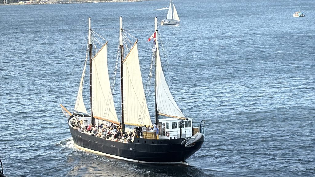 Während der Einfahrt hörte ich plötzlich ein Läuten, kurzerhand ging ich auf den Balkon und es waren Bojen, signalfarbig leuchtend verankerte Tonnen, die durch den Wind ein Glockenläuten von sich gaben. Eine sehr schöne Begrüßung wie ich finde. Das Wetter war um diese Zeit leider noch nicht so prickelnd, es war grau in grau, allerdings von der Temperatur angenehm, vielleicht sogar etwas zu schwül. Unsere Kabine bot einen herrlichen Ausblick auf die Gegenüberliegende Küstenseite und ein Eiland mit Leuchtturm. Während des Tages nahm der Bootsverkehr auf diesem Abschnitt immer mehr zu, Segelboote, Speed Boote, kleine Yachten und Ausflugsboote, ja sogar getakelte Ausflugsschiffe. Viele Ausflügler, vielleicht auch Vereine, verschiedene Gruppen waren auf den Schiffen und Booten unterwegs, mit lauter Musik, Gesang und Wink Gesten zu unserem Schiff. Es war sehr schön diese Lebensfreude zu erleben. Nach unserem Frühstück und dem Verlassen des Schiffes am Hafen Pier 22 gingen wir einfach los. Im Vorfeld hatten wir uns zwei Sehenswürdigkeiten über Google Maps rausgesucht, den Public Garden und die Citadelle von Halifax, letztere ließen wir jedoch ausfallen. Der Weg zum Park führte uns durch verschiedene Straßenzüge der Stadt, vorbei an alten Gebäuden, prächtigen Gebäuden, dem ältesten Friedhof der Stadt aus der Gründerzeit, Kirchen und Kathedralen und einer Einkaufsmeile. Der Haupteingang zum Public Parc besticht durch ein großes schmiedeeisernes Tor mit Verzierungen und Intarsien. Der Park ist etwas aufgeteilt und sehr schön angelegt, mit Ententeichen, runden und geschlungenen Blumenbeeten, einem Springbrunnen und einem Pavillon. Auf dem Gelände befindet sich auch ein Gebäude aus dem Jahr 1847 im typischen Baustil, das genutzt wird als Besucherzentrum und Lokalität für kleine süße saure Speisen, kalte und warme Getränke. Ein klein bisschen gestärkt stellte sich nun die Frage Citadelle oder Schiff, Ergebnis – wir gehen langsam zurück zu Schiff. Das schwüle Wetter hat uns doch etwas angestrengt. Auf dem Rückweg, eine andere Route, um noch mehr zu sehen, schlenderten wir durch einen weiteren kleinen Park mit Springbrunnen und einer richtigen Baumallee, auf der gegenüberliegenden Seite eine Kirche für alle. Und wieder zahlreiche ältere, typische Gebäude aus der Gründerzeit, herrlich anzuschauen, Häuser fast wie in San Francisco. Bevor wir unser Schiff und Pier 22 ansteuerten, gingen wir noch einige Meter über den Boardwalk am Ufer, auch hier lässt es sich gut verweilen und die Aussicht genießen. Es finden sich auch ein paar Denkmäler, wie zum Beispiel für die Immigration/Auswanderung aus Europa nach Amerika. Entlang des Weges zum Anleger säumen wieder zahlreiche Geschäfte die Straße, Ausflugsbusse reihen sich auf und ein alter Bahnwagon der Canadian Railway ist hier ausgestellt. Ebenso findet sich eine Statue von Emanuel Cunard, Gründer der gleichnamigen Cunard Line, der Reederei, zu der auch die Titanic gehörte. Im Hafenterminal findet man zudem die üblichen Geschäfte mit Souvenirs und Mitbringsels. Den restlichen Nachmittag verbrachte ich auf dem Balkon unserer Kabine, mal dösend, mal die Aussicht genießend und beobachtete interessiert den Schiffsverkehr mit Seglern und natürlich den zuvor beschriebenen Ausflüglern. Am Abend änderte sich das Wetter dann schlagartig, man konnte verfolgen, wie Wolken in die Bucht einzogen, aber es blieb trocken. Um 19:30 Uhr liefen wir aus dem Hafen von Halifax mit der Mein Schiff Hymne aus, die Mein Schiff drehte um 180 Grad und es ging auf die letzte Etappe mit einem See Tag in Richtung Bayonne im US Bundesstaat New Jersey, dem Kreuzfahrthafen der Metropole New York, den wir am 08.09.2025 gegen 7:30 Uhr erreichen werden.