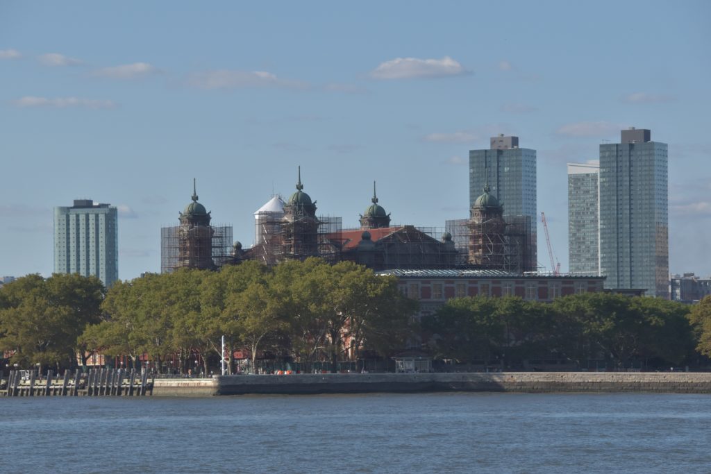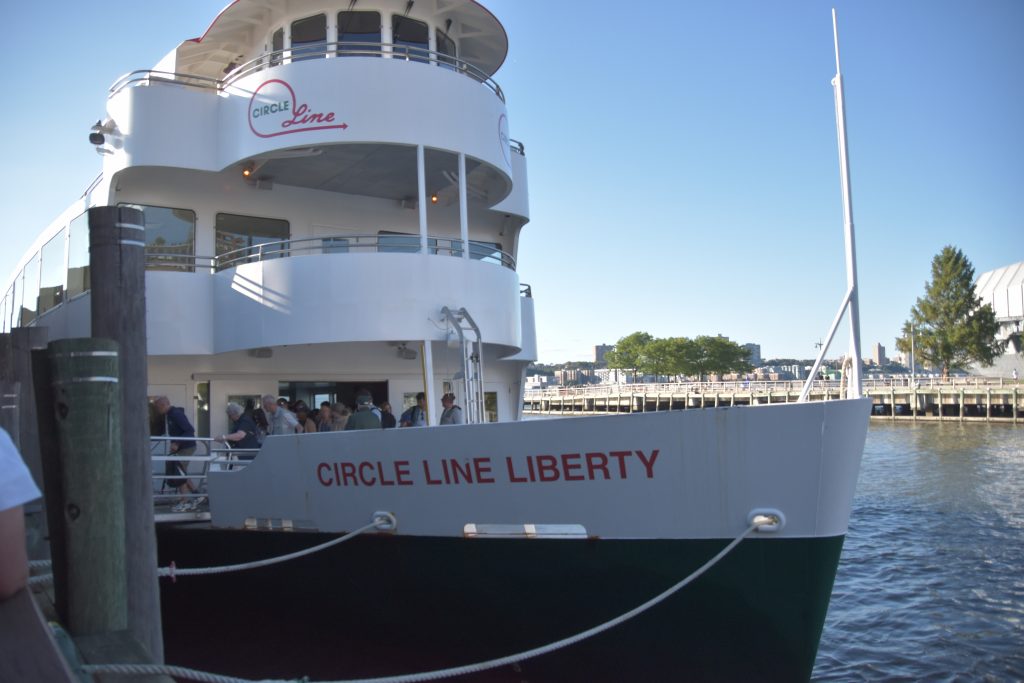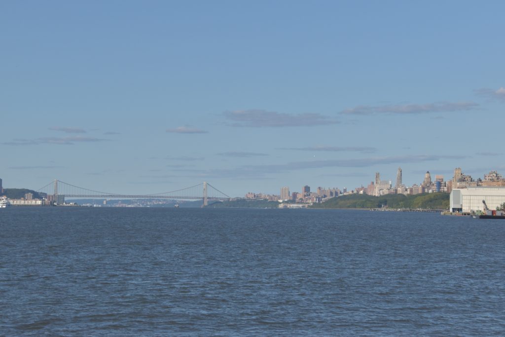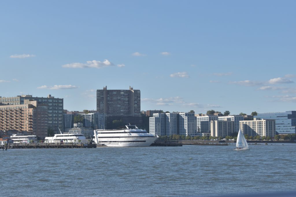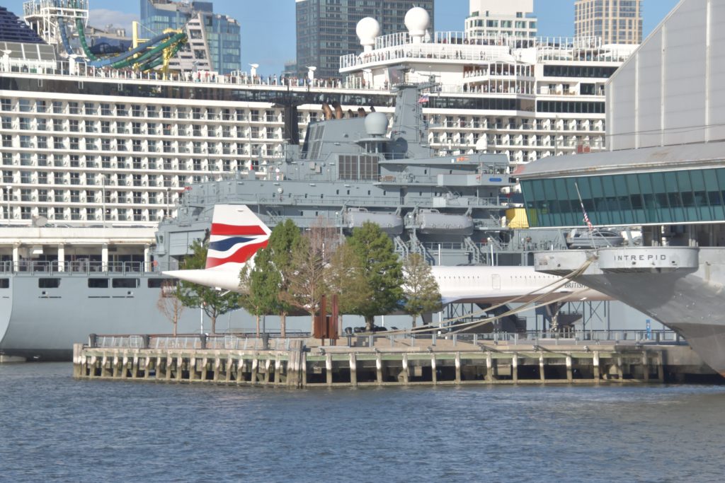 Unser Bus stand schon bereit, die Fahrt fortzusetzen, und es ging weiter zum Pier 83, unserer Anlegestelle für die gebuchte Bootsfahrt auf dem Hudson River. Nach der Ankunft am Pier hatten wir noch etwas Zeit, so schlenderten wir über die Anlage. Der Hudson Park mit Springbrunnen in der Mitte und einem herrlichen Blick auf die Skyline und die Silver Towers mit unzähligen Wohnungen. In unmittelbarer Nähe befindet sich auch ein Marinemuseum mit einem Flugzeugträger, einem weiteren Marineschiff und einer ausgemusterten Concorde der Air France. Nachdem unser Reiseführer die Tickets besorgt hatte, stiegen wir auf unser Ausflugsschiff, nichts ahnend, dass wir noch eine gute dreiviertel Stunde bis zur Abfahrt warten mussten. Zwischendurch machte der, wie ich vermute, Älteste an Bord immer mal wieder Durchsagen in Sachen Sicherheit und so weiter, vermutlich um das Warten etwas zu verkürzen. Nördlich von uns hatte ein anderes Kreuzfahrtschiff angelegt, von dort hörten wir lautstark Musik – es war wohl eine Party am Laufen. Dann ging es endlich, aber auch pünktlich los, und wir verließen den Anleger in Richtung Freiheitsstatue. Linkerhand die Skyline von Manhattan, vor uns die Freiheitsstatue und Ellis Island, dem ersten Ziel aller Einwanderer. Die Fahrt bot zahlreiche wunderschöne Fotomotive, wobei ein Foto bei weitem nicht die Eindrücke wiedergeben kann. Wir umrundeten die Freiheitsstatue und fuhren zurück in Richtung Anleger. Linkerhand wieder sehr beeindruckende Gebäude, alt und neu gemischt. Der Ausflug war auf alle Fälle lohnenswert.