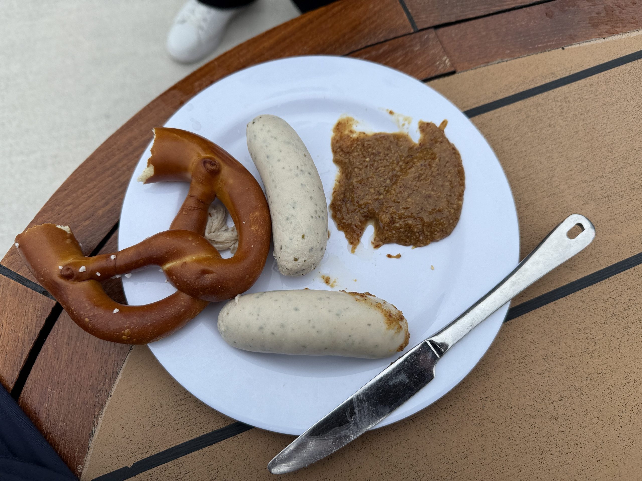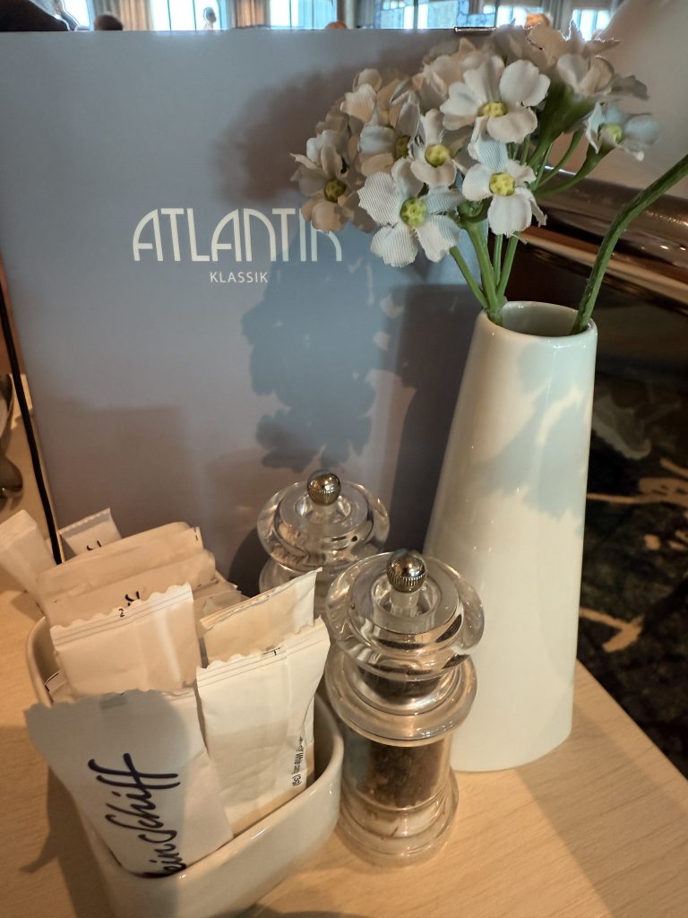 Der Tag begann diesmal auf eine etwas andere Weise als gewohnt: Auf dem obersten Deck des Schiffes fand ein zünftiger Frühschoppen mit einer Auswahl an bayerischen Schmankerln, kühlem Bier und stimmungsvoller Musik statt, die sofort für gute Laune sorgte. Natürlich konnten wir uns dieses besondere Erlebnis nicht entgehen lassen und mischten uns unter die vielen fröhlichen Gäste. Als quasi Frühstück entschied ich mich für eine klassische bayerische Kombination aus Weißwürsten, die mit süßem Senf serviert wurden, dazu eine frisch gebackene Breze; das Bier, obwohl verlockend, hoben wir uns für später auf. Den restlichen Tag verbrachten wir gemütlich in unserer Kabine, entspannten uns und genossen die ruhige Atmosphäre an Bord. Am Nachmittag gönnten wir uns einen köstlichen Eisbecher als kleine Belohnung, der wunderbar erfrischend war. Am Abend schließlich wurden wir im Restaurant Atlantik mit einem vorzüglichen 5-Gänge-Menü verwöhnt, das keine Wünsche offenließ. Den Tag ließen wir dann in aller Ruhe an der Bar ausklingen, allerdings hielten wir uns nicht allzu lange dort auf, da wir am nächsten Morgen früh aufstehen mussten, um pünktlich zu unserem gebuchten Ausflug zu erscheinen.