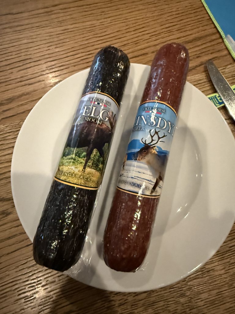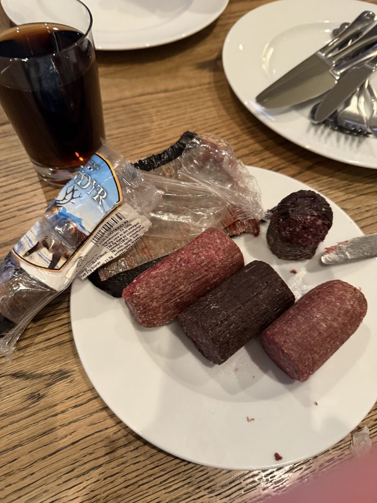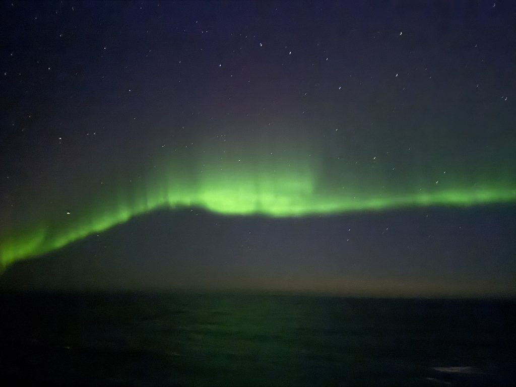 Tja, leider haben wir heute Morgen etwas verschlafen. Ich wurde gegen 6:00 Uhr wach, und mein erster Blick ging wie üblich über das offene Meer, um zu sehen, was sich draußen in Sachen Wellengang tat. Heute war etwas mehr los, und das Schiff tanzte auf dem Ozean. Dennoch konnten wir den Tag wieder sehr genießen, trafen unsere neuen Freunde aus Franken und spielten wieder ein bisschen in der Ebbe und Flut Bar. Highlight des Tages war die außerplanmäßige Brotzeit mit den in Bergen gekauften Salamis. Ich hatte aus Neugier die Rentier- und Elchsalami gekauft, ohne zu bedenken, dass diese bei der Einreise nach Kanada bzw. in die USA deklariert werden müssen. Auf dem Zollformular hatten wir das natürlich wahrheitsgemäß angegeben, uns dann aber entschlossen, die Würste vorher zu essen. Ich muss sagen, beide haben mir sehr gut geschmeckt, dazu etwas Artisanbrot, und fertig war eine leckere Brotzeit. Am Nachmittag fand auf dem Schiff die traditionelle Atlantiktaufe statt. Auf dem Pooldeck gab es eine Veranstaltung mit Neptun und seinem Gefolge. Neben Musik und Tanz wurden auch verschiedene ganz spezielle „Köstlichkeiten“ für die Gäste dargeboten. Während unserer letztjährigen Norwegentour hatten wir ein ähnliches Spektakel im Rahmen unserer Polarkreisüberquerung erlebt, mitgemacht und ein Zertifikat erhalten. Dieses erhält man aber auch, wenn man nicht aktiv an der Veranstaltung teilgenommen hat. Wir gönnten uns stattdessen ein Eis an der Eisbar und machten es uns im Ruhebereich mit Kaffee gemütlich. Den Nachmittag ließen wir dann ganz entspannt in der Kabine ausklingen, bevor wir zum Abendessen ins „Ganz schön gesund“ gingen und ich anschließend wieder an die Bar.