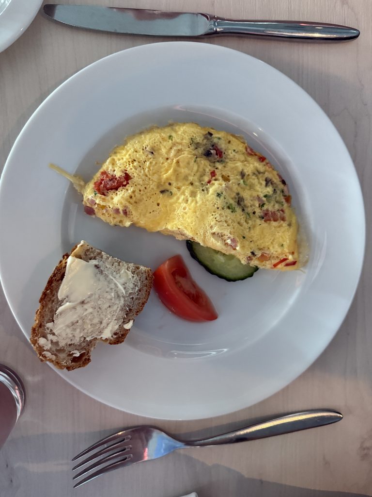 Wir starteten unseren Tag sehr entspannt und ließen uns dabei reichlich Zeit, um in aller Ruhe frühstücken zu gehen. So fühlt sich Urlaub an – ohne jeglichen Zeitdruck oder festgelegten Plan. Nach dem Frühstück gingen wir zunächst zurück in unsere Kabine und genossen einfach die wohltuende Ruhe. Wie üblich setzte ich mich auf den Balkon, ließ meinen Blick über das endlose Meer schweifen und beobachtete die vorbeifliegenden Möwen und Basstölpel, die elegant durch die Luft glitten. Dieses stille Beobachten wirkt auf mich immer besonders beruhigend und schenkt mir ein tiefes Gefühl von Zufriedenheit und innerer Ruhe. Am Abend rundeten wir den Tag dann mit einem leckeren und gesunden Essen im Restaurant „Ganz schön gesund“ ab. So ging dieser wunderschöne Tag völlig entspannt zu Ende.
