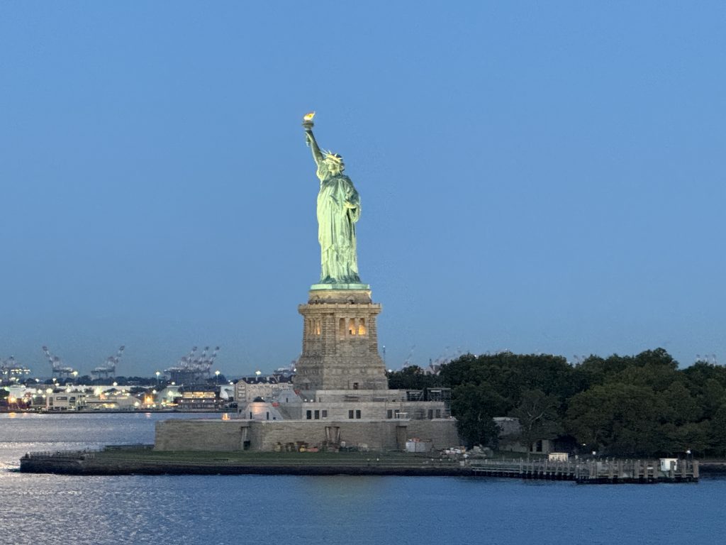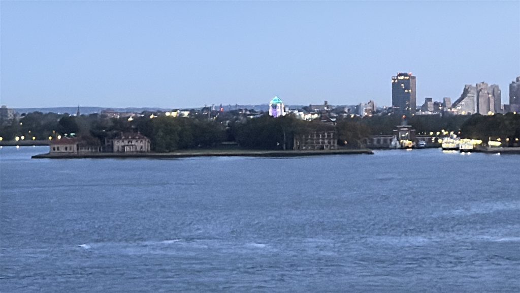 Der Kapitän informierte uns bereits gestern, dass um halb fünf Uhr früh der Lotse an Bord geht und eine direkte Vorbeifahrt an der Freiheitsstatue geplant und angefragt sei, allerdings die Genehmigung von den Behörden noch aussteht. So stellten wir uns den Wecker, um dieses Ereignis bestaunen zu können. Das erste Highlight war die nächtliche Sicht auf Manhattans Skyline von Long Island aus und die Fahrt unter der Verrazzano-Narrows-Brücke hindurch. Wie in Halifax wurden wir von läutenden Seetonnen willkommen geheißen und unser Schiff glitt langsam dahin. New York kam immer näher, vorbei an Governor’s Island mit freier Sicht auf die Freiheitsstatue, dank der Genehmigung der Behörden, und Ellis Island. Es war ein atemberaubendes Erlebnis und ein berührender Moment, wenn man in der Geschichte die Zeit der Einwanderer zurückdenkt.