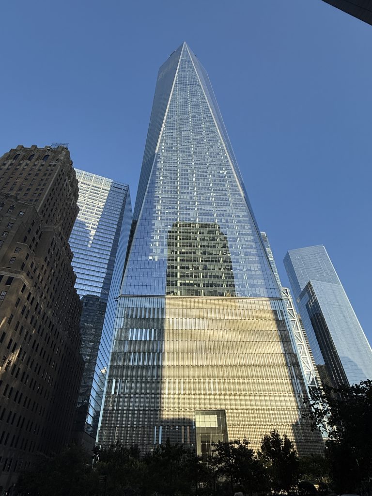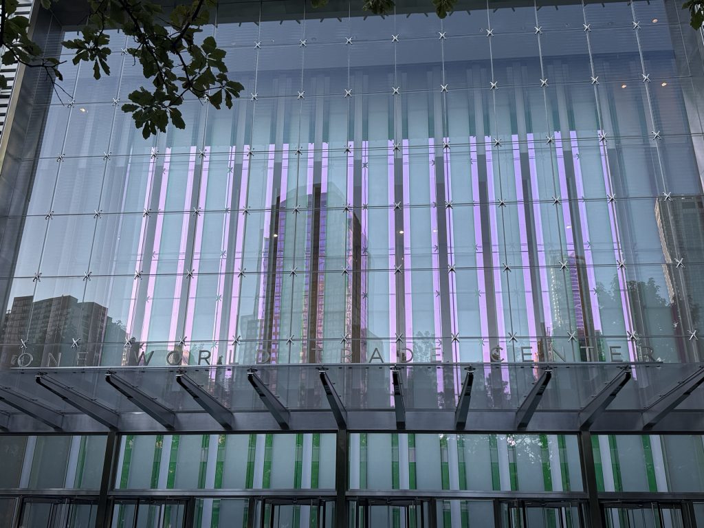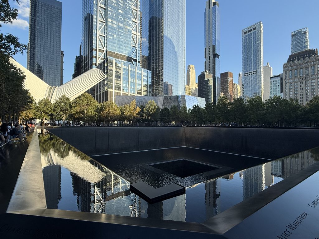Als wir zum Pier zurückkamen, stand unser Bus wieder bereit, und es ging zum Abschluss noch nach Downtown Manhattan zum One World Trade Center und der Gedenkstätte 9/11. In einer Seitenstraße stiegen wir aus dem Bus und gingen in der Gruppe gut fünf Minuten zu dem Memorial. Beeindruckend und ergreifend zugleich. Die beiden eingestürzten Twin Towers wurden durch jeweils ein Becken mit Wasserfall als Zeichen der Unendlichkeit nachgebildet, außerdem entstand ein Museum, in das Fundamente der Towers eingebunden wurden, und eine futuristische U-Bahn-Station. Wir hatten leider nur 15 Minuten Zeit, aber es lohnt sich, einen ausgedehnteren Aufenthalt zu planen, um alles in Ruhe und besinnlich auf sich wirken zu lassen. So ging ein wunderschöner Ausflug mit tollen Eindrücken und Erlebnissen zu Ende, und wir fuhren – dieses Mal durch den Holland Tunnel – zurück zum Schiff im Hafen von Bayonne, etwa eine dreiviertel Stunde Fahrt.