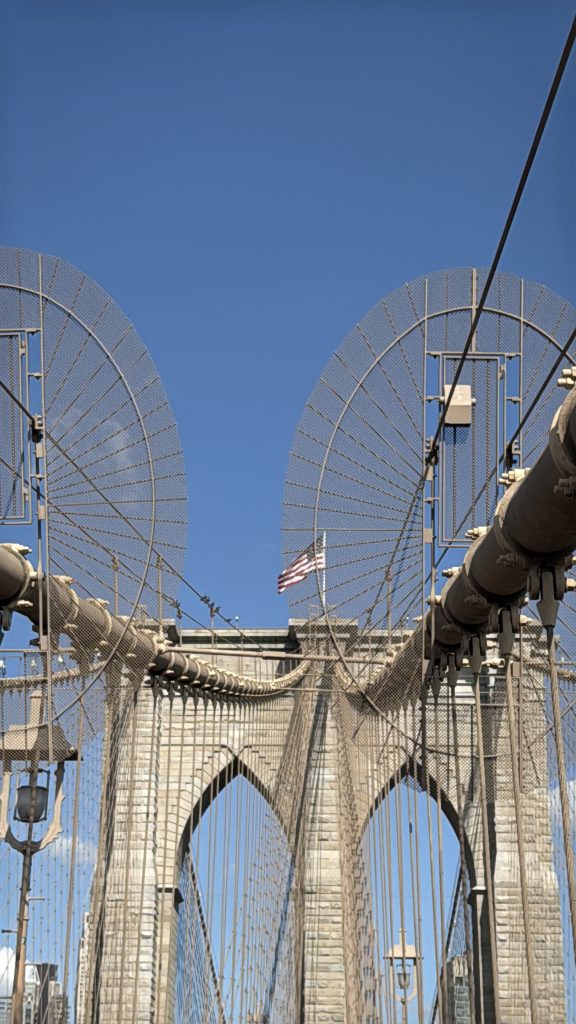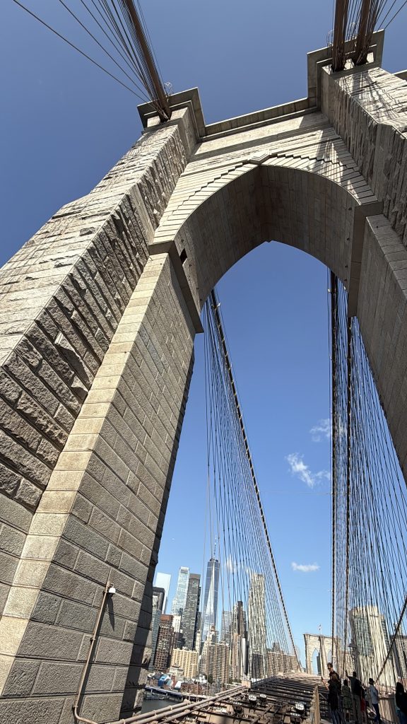 Der Zugang zur Brücke erfolgt über eine Treppe, und oben angekommen eröffnet sich der Blick auf das beeindruckende Bauwerk aus dem späten 19. Jahrhundert. Unser Reiseleiter erzählte, dass die New Yorker anfangs sehr skeptisch bezüglich der Stabilität der Brücke waren, da sie als erste Hängebrücke aus Stahlseilen gebaut wurde. Doch die Zweifel verflogen schnell, und die Brooklyn Bridge wurde zu einer Hauptverkehrsader der Stadt, die die Stadtteile Brooklyn und Manhattan verbindet. Es war ein besonderes Gefühl, über diese berühmte Brücke zu spazieren und die herrlichen Panoramen zu genießen.